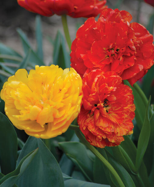 En spektakulär tulpan som likt en pion öppnar sig mer och mer för varje dag som går. Den skiftar också färg, från gyllengult över orange till orangerött. En stadig, doftande färgklick i rabatten under vårens sista veckor.