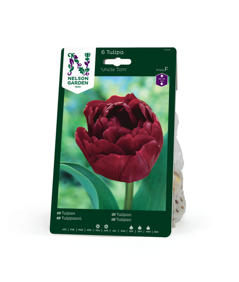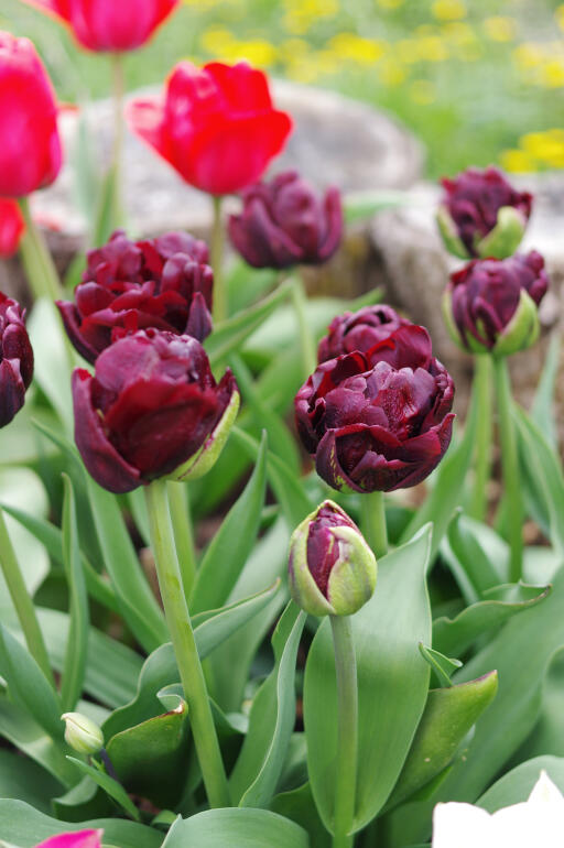 Ur en mycket mörk, nästan brun knopp slår denna djupt röda tulpan ut sitt överflöd av kronblad. Blomman liknar en pion eller en ros och är underbart vacker tillsammans med rosa eller vita tulpaner, vita narcisser eller blå pärlhyacinter.