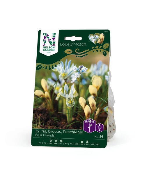 Vårens första skönheter för rabatt och kruka. Våririsens ljusblå färg är nästan självlysande och kompletteras av porslinshyacintens skira blommor i samma nyans, medan det djärva gula mönstret matchas av krokusens mjuka gula toner.